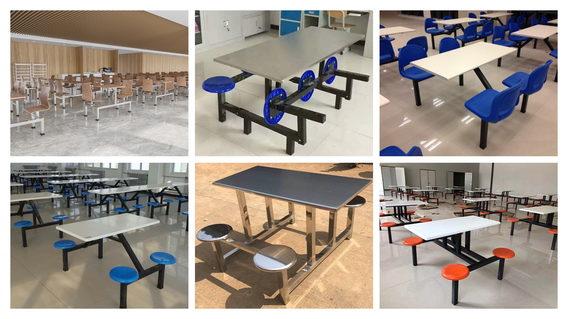 食堂餐桌用材比較廣泛,多以桌面與座椅相連接的款式為主。高度以720mm-760mm為標準,餐桌椅是人類日常生活和社會活動中使用的具有坐臥、憑倚、餐食等功能的器具。通常由若干個零、部件按一定接合方式裝配而成。給大家用餐時使用的桌椅,鋼木結(jié)構(gòu)居多,結(jié)構(gòu)簡單,顏色簡潔。